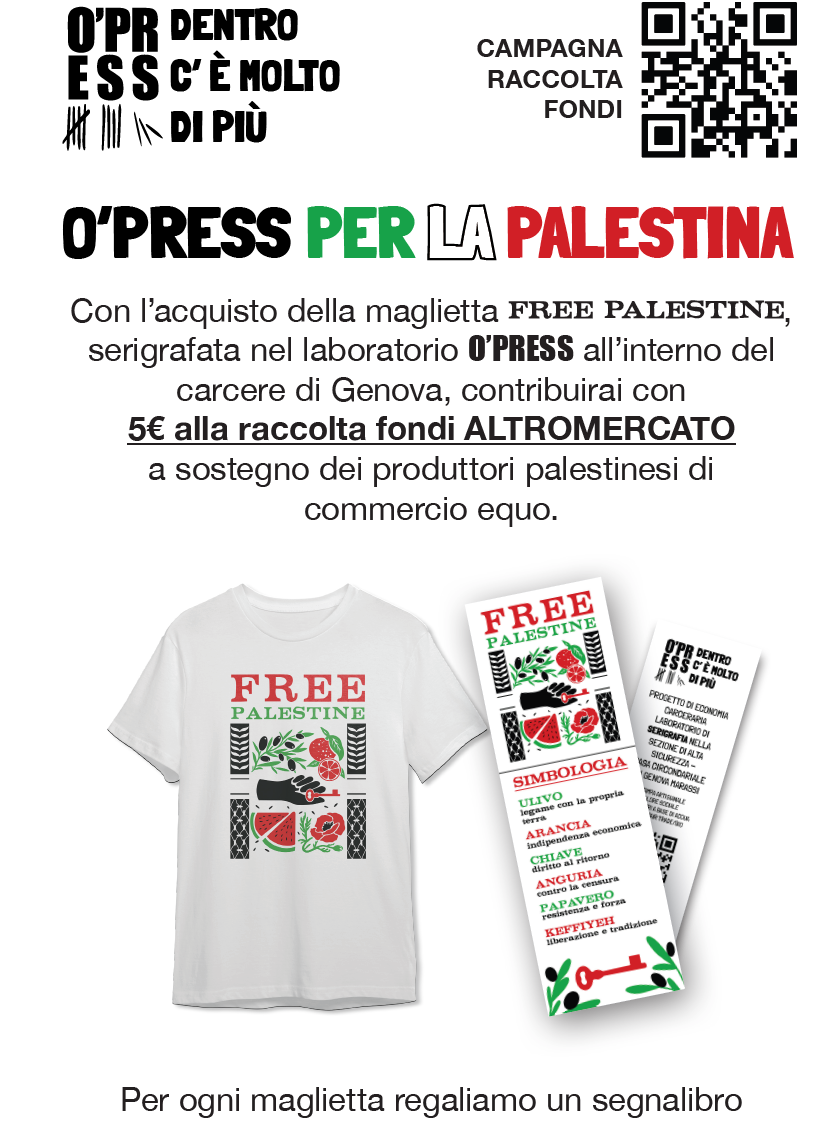Con l’acquisto della maglietta FREE PALESTINE, serigrafata nel laboratorio O’PRESS all’interno del carcere di Genova, contribuirai con 5€ alla raccolta fondi ALTROMERCATO a sostegno dei progetti palestinesi di commercio equo.