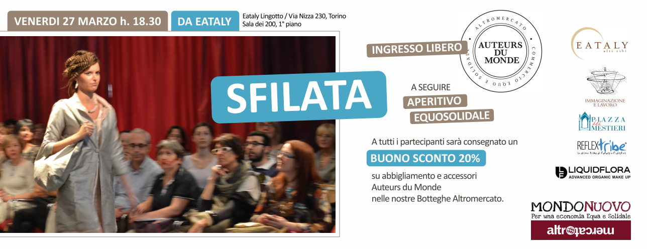 Ti invitiamo alla presentazione della nuova Collezione Moda Auteurs du Monde by Altromercato, venerdì 27 marzo 2015 a Torino da Eataly. La sfilata sarà introdotta dalla stilista Marina Spadafora e mostrerà i capi di abbigliamento e accessori della collezione Primavera/Estate.